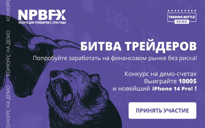 Очередной конкурс "БИТВА ТРЕЙДЕРОВ" стартует. Успейте зарегистрироваться и получите шанс выиграть 1000 USD и iPhone 14 Pro! Конкурс "БИТВА ТРЕЙДЕРОВ" проводится ежемесячно на демо-счетах в торговой платформе MetaTrader 4 компании NPBFX. Для участия в конкурсе предоставляется конкурсный демо-счет с балансом 5’000 USD. Победителями становятся 10 участников конкурса, сумевших максимально увеличить начальный депозит в ходе проведения конкурса. Обязательными условиями получения призов является получение прибыли в размере не менее 30% от начального депозита и заключение не менее 10 сделок на конкурсном демо-счете. Призовой фонд конкурса распределяется между победителями конкурса следующим образом: Призовые средства учитываются на балансе торгового счета и доступны для совершения торговых операций. Прибыль, полученная от торговых операций, совершенных на призовые средства, полностью доступна для вывода. Приз iPhone 14 Pro вручается участнику, занявшему первое место и увеличившему начальный д