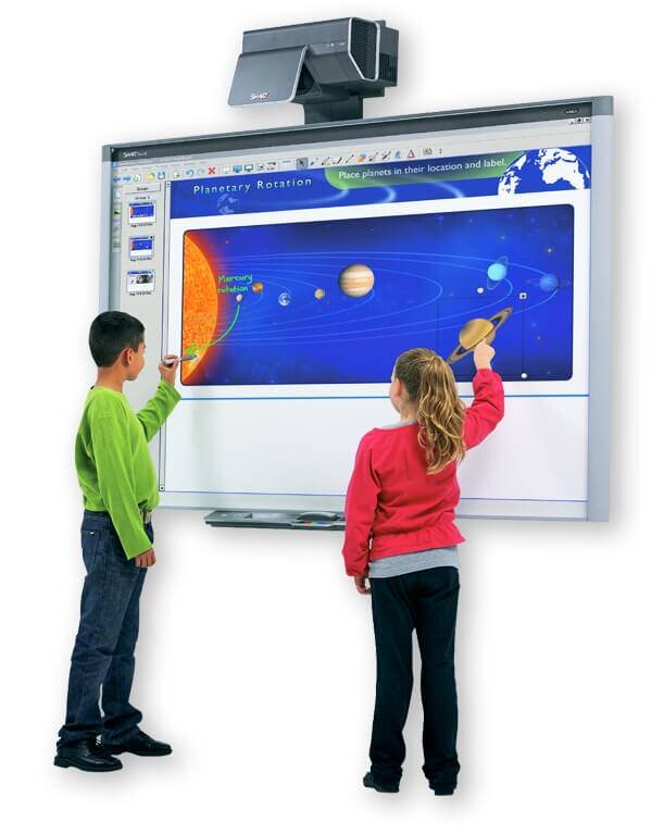 Интерактивная доска - это сенсорный экран, подсоединенный к компьютеру, изображение с которого передает на доску проектор. Чтобы начать работу на компьютере, достаточно только прикоснуться к поверхности доски.