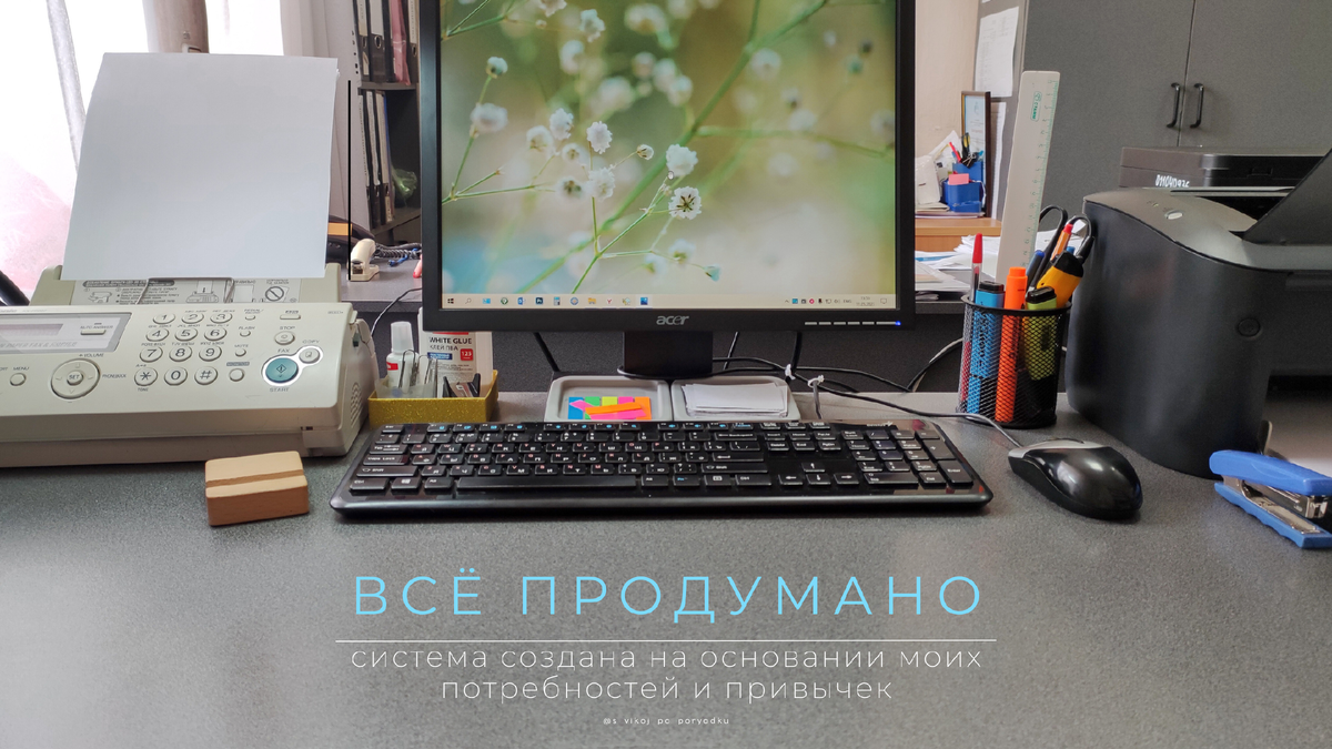 Давно хотела рассказать о своём рабочем месте, ведь здесь я провожу очень много времени. И это весомая причина для того, чтобы по уму всё тут разместить. Работа, как таковая, предполагает ситуации с быстрым реагированием. К примеру нужно вотпрямщас распечатать документ и отнести на подпись. А его нужно скрепить чем-то и залипучку наклеить, да не мешкать. Или записать что-то, пока руководитель быстро-быстро надиктовал задание. Организованное пространство помогает быть продуктивным.