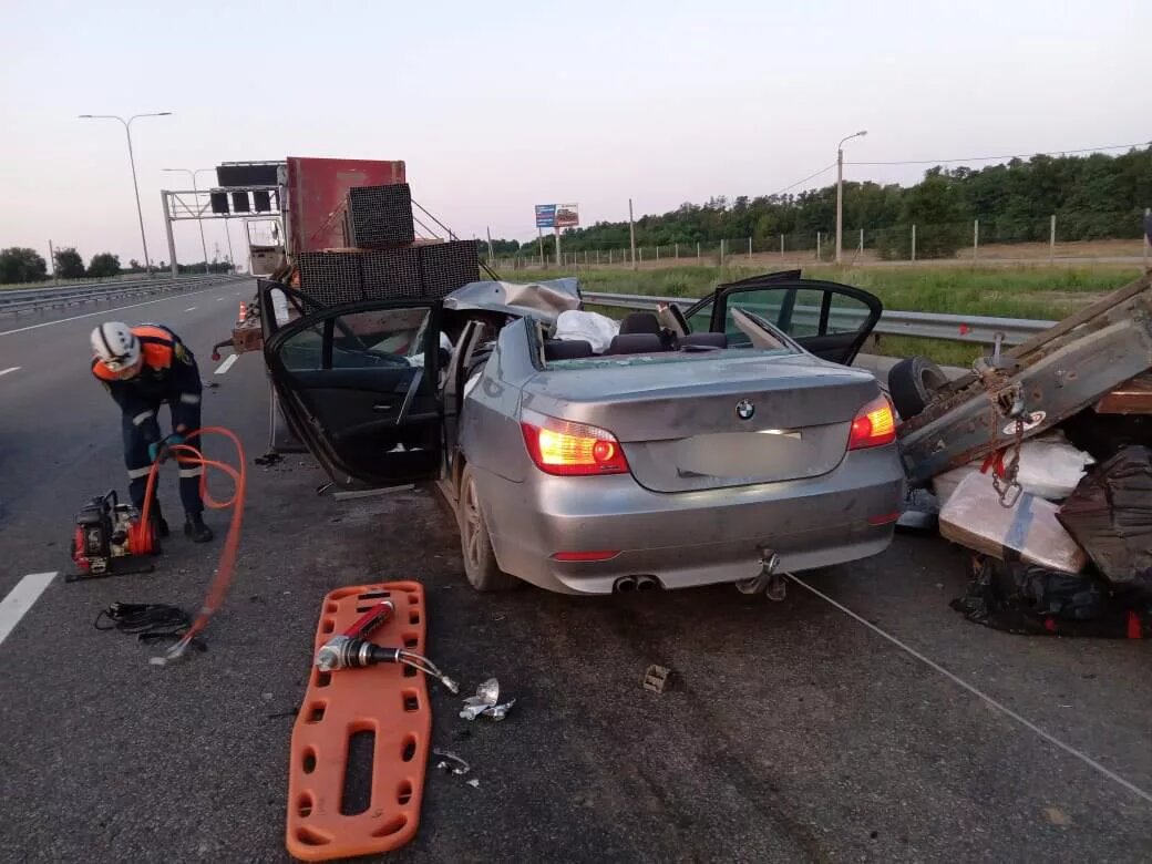 После жуткой аварии в Аксайском районе пассажиров BMW пришлось вытаскивать спасателям. 31 июля на трассе М4 «Дон» в Ростовской области столкнулись BMW с прицепом и «МАЗ». По сообщению сотрудников ГИБДД, авария произошла в ночь с 30 на 31 июля (в 4.20 часа) на территории Аксайского района – 1036 км трассы М4 «Дон». Водитель иномарки, по предварительным данным,не выдержал безопасную дистанцию. И врезался в грузовик, который ехал перед ним. Легковым автомобилем управлял мужчина 1984 года рождения, также в салоне находился пассажир 1960 года рождения. Оба они после столкновения на трассе в Ростовской области оказались зажатыми в искореженном BMW. Прибывшим на место ЧП спасателям пришлось разрезать номерку и вытаскивать пострадавших. Спасенных доставили в Новочеркасскую ЦГБ. Фото: Жуткая авария в Аксайском районе на 1036 км трассы М4 «Дон».