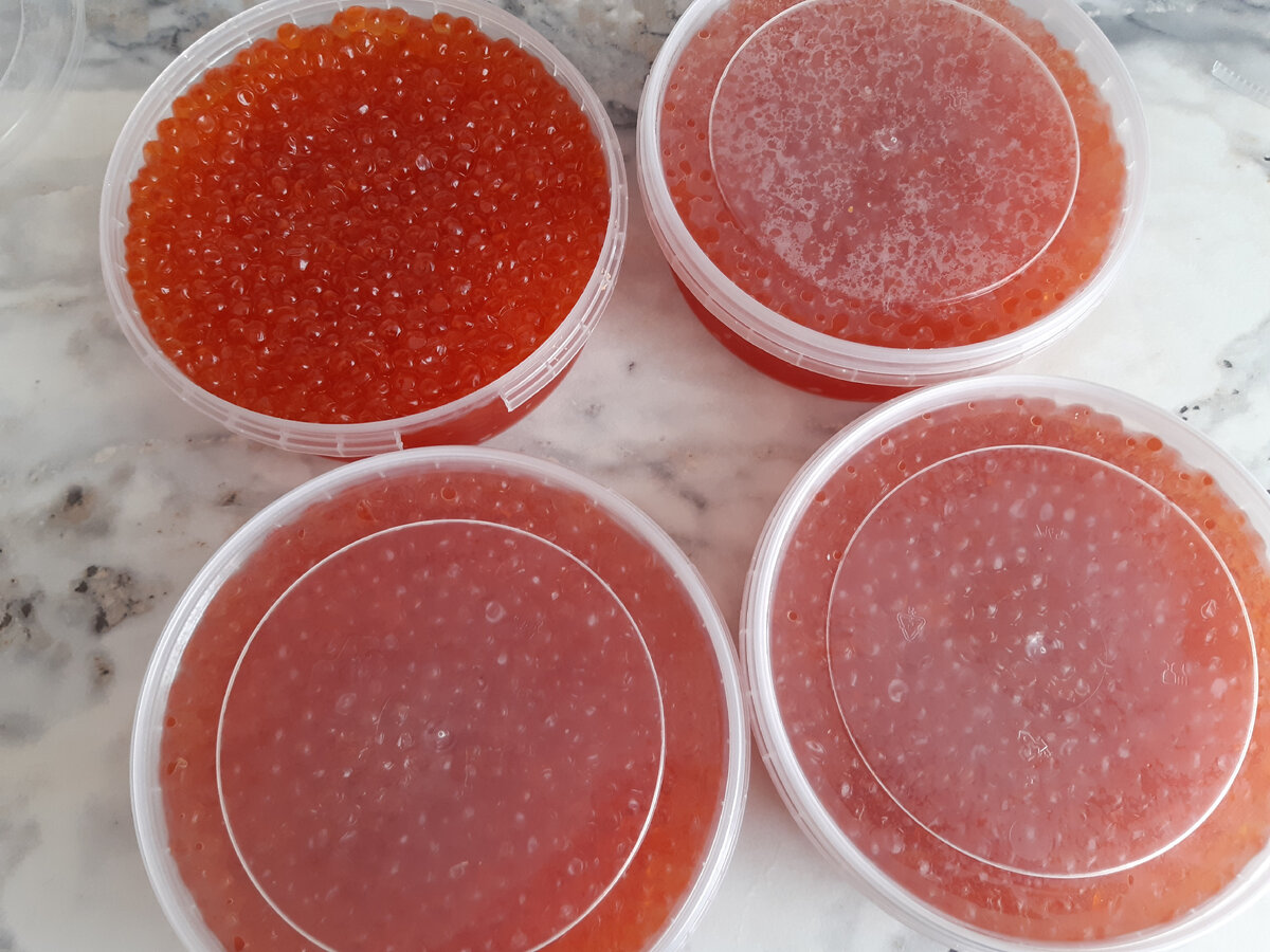 Икру я расфасовала по маленьким баночкам. Оставила нам на один завтрак, еще банка 0,5 кг целиком будет к Новому году, все остальное разложила в банки по 250 мл. Все банки заморозила. Мы так закупаем икру раз в год, и потом на все праздники достаем по баночке на бутерброды.