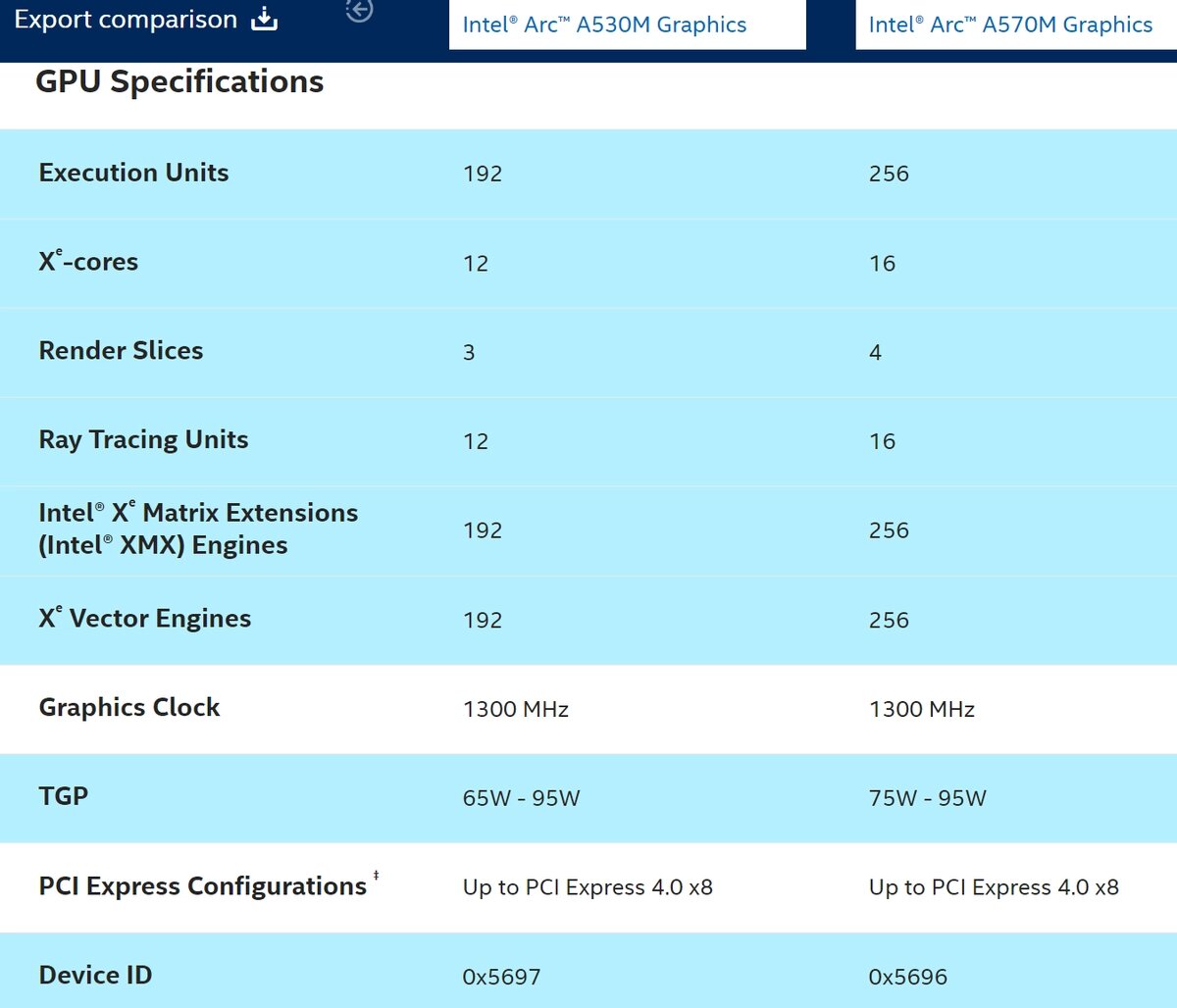 Компания Intel расширила семейство мобильных видеокарт ARC из семейства Alchemist двумя новыми решениями, но сделала это без каких-либо анонсов. К счастью, у нас есть информация обо всех характеристиках этих видеокарт, а потому мы знаем, что это решения с 16 и 12 Xe-ядрами у A570M и A530M соответственно. Интересно в данной ситуации то, что характеристики A570M фактически совпадают с таковыми у A550M, но Intel решила разделить их разницей в тепловыделении и рабочих частотах графического чипа.