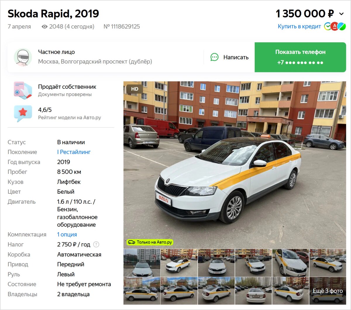 В рубрике «Не бит, не крашен» уже бывали автомобили после такси. И продавцы обычно не афишируют этот факт. Но с героем нового выпуска ситуация другая — автор объявления прямо сообщает о том, что машина была зарегистрирована для работы в таксопарке. Да и продаётся она в «рабочем» виде. Это — рестайлинговый лифтбек Skoda Rapid первого поколения 2019 года выпуска. Машина оснащена атмосферным 110-сильным двигателем и газобаллонным оборудованием. При этом на одометре у неё не сотни тысяч километров, которые обычно наезжают такие автомобили, а всего около 8500 км. Поэтому и цена совсем не бросовая: 1 350 000 рублей. На фотографиях на первый взгляд всё нормально — свежий лифтбек с аккуратным салоном. Впрочем, при более детальном рассмотрении можно заметить неровный зазор у кромки капота. Неужто Rapid попал в ДТП, не проехав и 10 тысяч километров? И аварию нельзя исключать, ведь продавец в комментарии прямо говорит о том, что Шкода успела побывать в малярном цеху. Комментарий продавца Автомоби