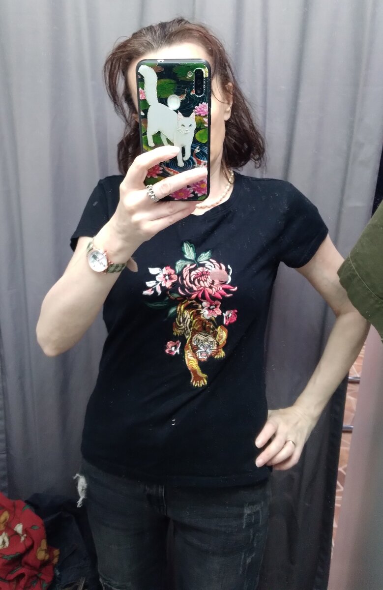 Здравствуйте. Я человек не завистливый, но заглядывая в холодильник ловлю себя на мысли, что я завидую продуктам. Так вольготно лежат сосисочки, яички, смородина в миске и так далее, так им прохладно и замечательно, такие они бодренькие и весёлые. А мне жарко, сил нет, у меня уже мозг плавится и как вариант может вытечь. Правильно говорят, что живому человеку не угодишь, то лето холодное и дождливое, то жара донимает. Обзор из Столичного гардероба, всё можно было купить со скидкой 80%. Хлопковая футболка с вышивкой. Красивая вышивка и морда тигра хорошо вышита, а это больное место, видела очень грустные примеры. Но горловина футболки безобразно растянута, носили её неплохо и это очень плохо((. Полная цена 450 руб. Платье с запахом. Рукава с разрезами и завязками на запястьях. Цвет ближе к терракотовому, у меня на фотке он совсем другой получился. Сразу платье не купила, пришла через несколько дней, но его уже не было. Вискоза. Полная цена почти 1000 руб. Блузка из вискозы. На груди з