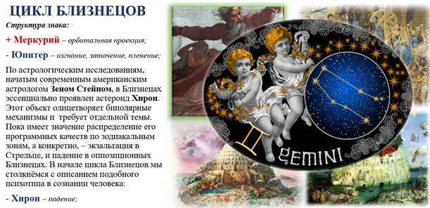 И как можно идею грозного и карающего бога эпохи Овна трансформировать в идею вселюбящего создателя для следовавшего за ней цикла Рыб? Только методами мудрёной софистики, противоречивыми алогизмами, утопической демагогией, прикрывавшейся авторитетными именами духовных учителей, мощным подчинением человеческого ума стереотипам религиозных догм, искусно внедряемых в социально-общественные нормы. Этими когнитивными искажениями и склонен «грешить» близнецовский Юпитер. А истинно любящий родитель будет с пелёнок воспитывать в своём чаде личность, которой по мере развития самостоятельного мышления следует при неизбежных запретах по возможности объяснять «почему?». Как это происходит с любопытными малышами, способными навредить себе, балуясь с огнём или колюще-режущими предметами? Осторожно прикасаемся к чему-то горячему или острому, провоцируя лёгкие болевые ощущения, а после имитации травматичного опыта, выносится вердикт – «нельзя!». Ничего и близко из этого мы не видим, погружаясь в библейскую атмосферу цикла Близнецов. А что в конечном итоге выдаёт нам вновь победивший отрицательный полюс знака из симбиоза Юпитера с Хироном? Только апофеоз ущемлённого в своих притязаниях раздутого авторитета, не желающего признавать кризисное состояние своих полномочий. «РАЗДЕЛЯЙ И ВЛАСТВУЙ!» – пример юпитерианской мстительности, вдохновлённой падшим Хироном, когда гигант по объективным обстоятельствам оказался «униженным» на отрицательной полярности прецессионного цикла. С астрологической точки зрения описание юпитерианской роли в Близнецах вполне зачётно, но как это можно преподносить поколениям религиозных адептов в качестве деяний могущественного бога, в которого следует свято верить, надеяться и молиться??? Стоит ли после этого удивляться, что ментальная природа человека не меняется тысячелетиями?