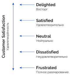 Для данной оси Кано предлагает формат измерения от «полное удовлетворение» или «восторг» до «полное разочарование».