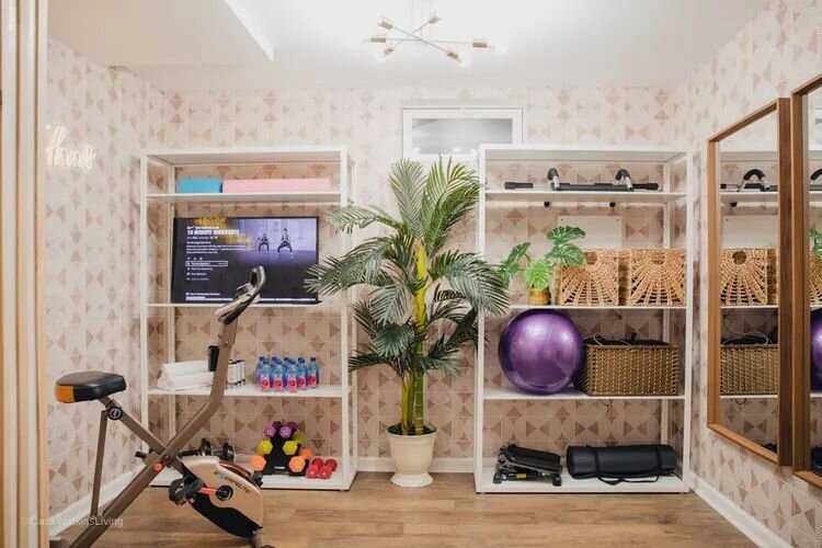 Выше мы упомянули про занятия спортом и спортуголок. Прекрасная, между прочим, мысль. Пространство пустует, почему бы не задействовать его под спорт? Беговая дорожка, шведская стенка, канат, турник, велотренажер, коврик для занятия гимнастикой или йогой – нет проблем. Тогда и пространство оформляем для удобства занятий спортом. Поработаем над звукоизоляцией (привет соседям), под тренажеры положим специальные прорезиненные коврики.