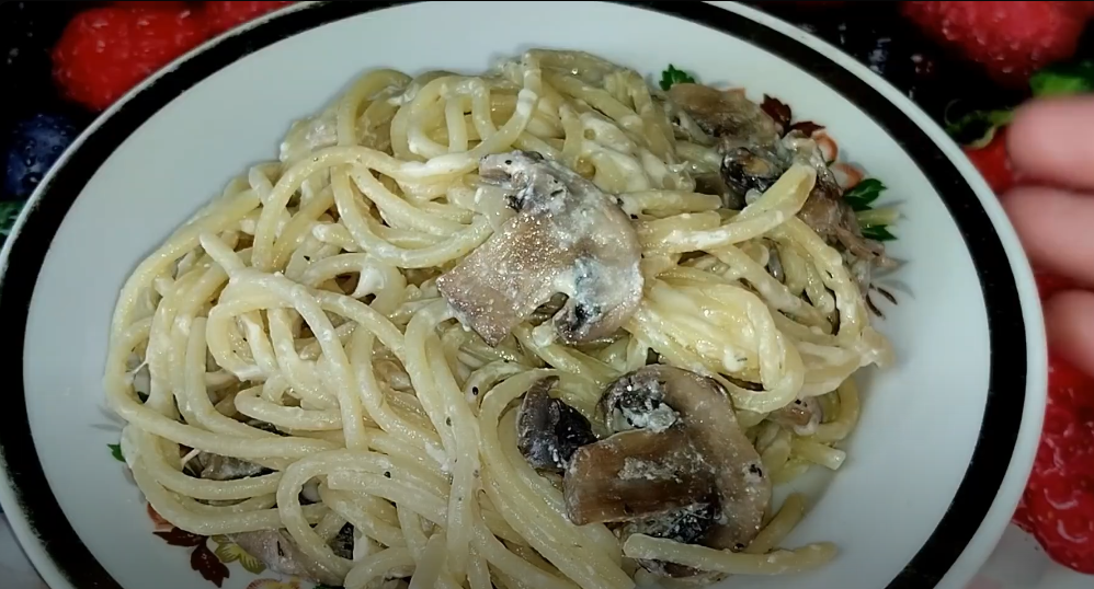 Нет времени на готовку? Хочется чего-то вкусного и необычного? Предлагаю вашему вниманию рецепт спагетти с грибами в сливочном соусе. Этот и другие рецепты я сохранила в Сборнике рецептов (он постоянно пополняется) Для приготовления понадобятся следующие ингредиенты: Спагетти - 200 гр (в сухом виде) Шампиньоны - 150 гр Сливки - 0,5 стакана Сыр твердый - 100 гр Лук - 1 шт Соль, итальянские травы. Приготовление: 1. Обжарить на сковороде лук. 2. Шампиньоны нарезать тонко, добавить к луку. Обжаривать до готовности. 3. Добавить соль и итальянские травы. Или другие специи по вашему вкусу. 4. Добавить сливки и довести до кипения. 5. Выложить в сковороду предварительно отваренное спагетти и натертый на терке сыр. 6. Все тщательно перемешать. Удобно сделать это двумя вилками. 7. Спагетти с грибами в сливочном соусе готово, приятного аппетита! Можно посмотреть видео: