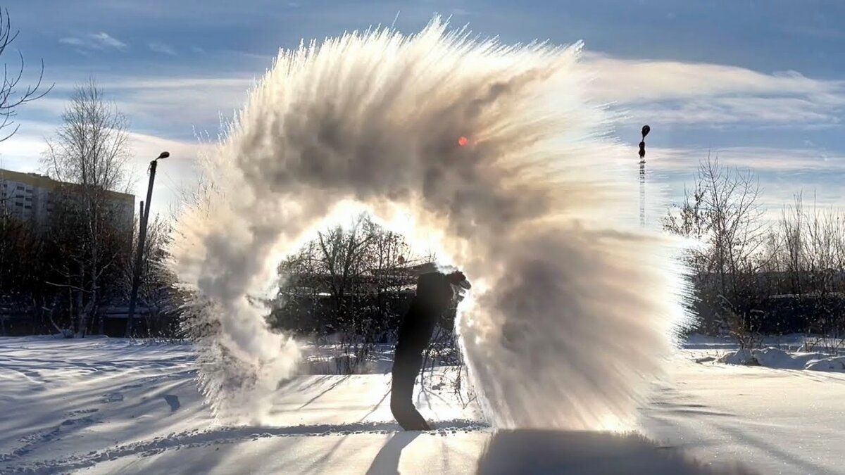 «Сибирский фейерверк» — так в сети называют трюк с разбрызгиванием крутого кипятка на морозе. Года три назад рунет развлекался роликами под тегом #дубакчеллендж. Посмотреть их можно и сейчас. Кружку с кипятком выносят на мороз (ниже −30°С) и выплёскивают воду в воздух. Капли воды мгновенно превращаются в облако снега. Выглядит эффектно, особенно на фото и видео в режиме slow motion. Если использовать холодную воду, такого эффекта не будет.