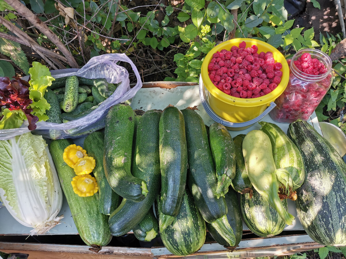 Для тех кто не смотрит ролики, вот фото. Утром пошла собирать урожай спустя три дня отсутствия на участке. Количество кабачков - обнять и плакать. Да так то и огурцы тоже в стороне не остались, целый пакет набрался, а учитывая что вчера один добрый дяденька тоже подкинул Ивану пакет огурцов, я сейчас сижу на кухне и думаю О Боооооже, дай мне сил! И терпенья одолжи... А от малины я вообще такой подставы не ожидала, думала будет там литра 2, уже заканчивается она. Ага. Когда собрала 1,5 литра только ремонтантной поняла что ошиблась. Я уже её заморозила сколько надо нам, сделала компот, сварила баночку варенья, соседям продавала и так отдавала, кажется что никому уже не надо малины. И это ведь не всё, сейчас вот допишу и пойду ещё собирать... Кабачки заодно принесем домой, хоть несколько штук. Куда их девать я правда пока не знаю. Наверное ещё раз приготовлю рулетики, икры на поесть, на зиму её запасать бесполезно, никто есть не будет. В этом году из овощей в основном консервирую