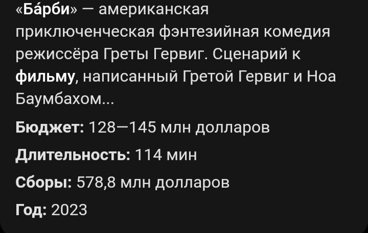 Да этого шедевра ждала , чтоб посмотреть уж больно его разрекламировали 🤪 что пушка , бомба💣 прям форсаж фильм переплюнул 🤭 ну или чё там крутое в кино прокатах было ну вот результат 🖋️📑 Но я думаю люди шли посмотреть чет потрясное ведь Барби 💃 это любимая игрушка всех девчонок , играли в нее все да и теперь играют и в наше время девчонки и поэтому дети и взрослые побежали смотреть фильмец про Барби 💃 ну как не пойти в кинотеатр и не посмотреть про любимую 💞 куклу целое кино такого и не было раньше только мультики про нее. Но посмотрев наверно минут 10 понимаешь, что это только детям смотреть очередной мультик . Пластмассовый город Барбиленд все конечное розовое .Барби показывают во всех профессиях , Кены занимаются ..да ничем собственно 😊😆 и не занимаются развлекаются только. Но тут случилась проблема с Барби и она отправляется в реальный мир с Кеном . Вот тут стало интересненько Кену , понравилось находиться в нашем мире от того , что мужчины всем командуют и