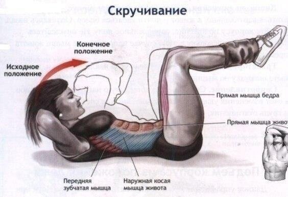 Цепляйся ногами за батарею или за нижнюю часть дивана, руки за голову и давай качаться. Высоко поднимать корпус не нужно. Сделай столько раз, сколько сможешь, а потом прибавляйте по 2 раза в день. Хорошо дойти до 40-50 раз, а затем постепенно увеличить до 100.