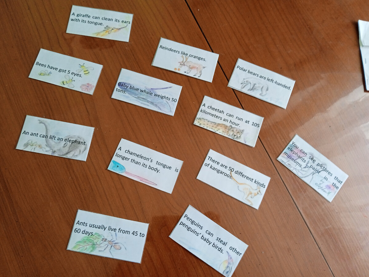 Добрый день! Сегодняшняя игра посвящена популярной разговорной теме, которая обязательно есть в каждом учебнике, - животным. По опыту, дети ее любят и осваивают, в целом, легко. А то, что дается легко, грех не использовать) Например для повторения и закрепления других пройденных тем – как лексических, так и грамматических. Вариантов тут масса – от описания картинок до загадок разной степени сложности. И я их все использую в работе. Но в данном случае я выбрала вариант “True-False”. Задача, в общем то, проста – прочитать утверждение на одной стороне карточки, предположить, правда это или неправда, и узнать ответ на обороте. В зависимости от вопроса он может быть кратким или развернутым. Вот так выглядит лицевая сторона карточек: А так оборотная: В чем плюсы такой игры? Ну во-первых, в азарте – детям всегда интересно взять себя "на слабо"- угадают или не угадают. Причем, никогда не знаешь, что их больше порадует. Порой осознание, что не угадали, и неожиданный поворот вызывает даже больш