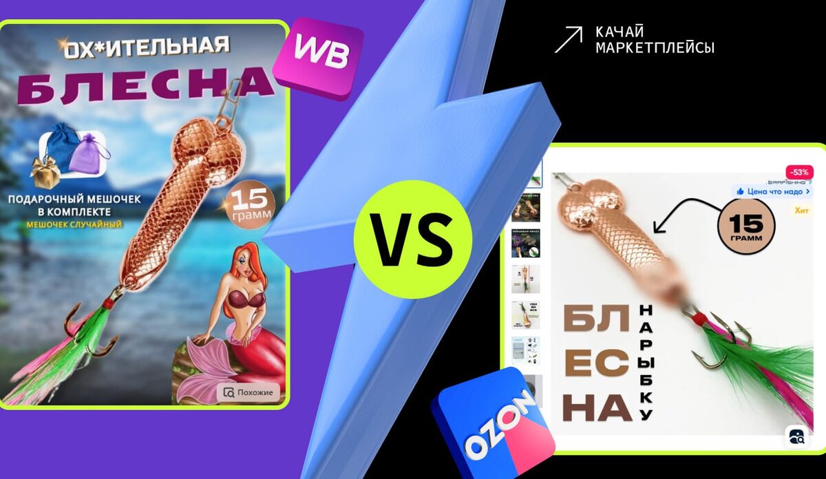 👻 В чем разница между WB и Ozon? Многие селлеры задают этот вопрос, когда выбирают площадку. Мы много об этом рассказываем. А теперь давай на конкретном примере проиллюстрируем. Вот недавно по пабликам прошла волна ох... очешуительных новостей про топовую блесну для рыбалки. И рыбаки в восторге, и рыба довольна, и даже русалки пищат. Вернемся к маркетингу. Обрати внимание, что играть на грани фола пока что позволяет именно фиолетовый маркетплейс. И посмотри на оформление этого же товара у синего маркетплейса. Весь смак дерзкой пиаркомпании стыдливо замазали, чтобы не платить штрафы за непотребство. О штрафах, которые рассылает робот-проверяющий под маркой «услуги», от которой нельзя отказаться, мы писали в статье на Дзене. Напиши в комментариях 👇, какой МП тебе ближе по духу — беззастенчивый WB или интеллигентный Ozon? И не забудь подписаться на наш дерзкий канал, тут точно не соскучишься🔥