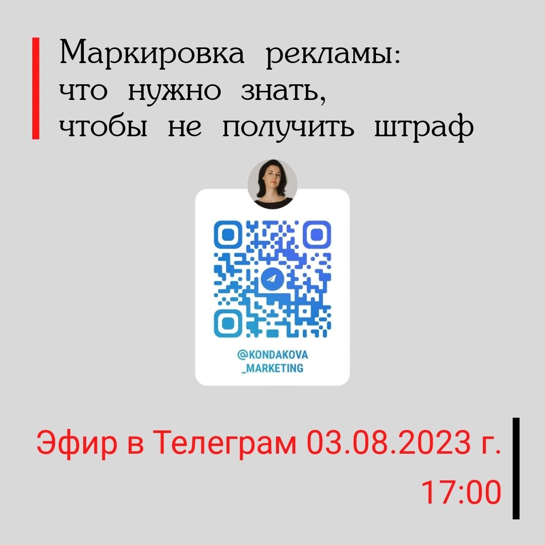 Друзья, 03.08.2023 г. в 17:00 буду в гостях в эфире у @kondmar на её Телеграм-канале https://t.me/kondakova_marketing. Мы с Ольгой поговорим на тему маркировки рекламы, а именно: что нужно знать, чтобы не получить штраф! ✅ Какую рекламу нужно маркировать, а какую - нет? ✅ Достаточно ли просто поставить # реклама и обойтись без маркировки? ✅ В каких случаях подрядчик должен в обязательном порядке маркировать рекламу за вас? ✅ Что обязан сделать блогер при размещении вашей рекламы на канале? ✅ Какие посты в соцсетях являются рекламой? ✅ Подлежит ли маркировке самореклама? В общем, нас ждет незабываемый вечер! Будем рады видеть вас на эфире 03.08.2023 в 17:00👍 Приходите! https://t.me/kondakova_marketing *Включите уведомление, чтобы не пропустить!