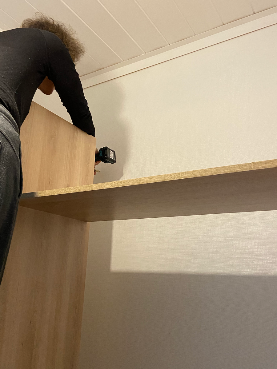 Да, друзья, это был период, когда мужская часть семьи никак не могла помочь нам в этом грандиозном деле. Пришлось справляться самостоятельно. :) Начало повествования можно прочитать здесь. А я рассказываю дальше. После того, как основная конструкция шкафа была построена, его нужно было прикрепить к стене, так как в высоту он был 240см, в ширину 130 см и в глубину 40 см. То есть - имел большой "руль" и мог легко опрокинуться вместе с содержимым. Стена за шкафом у нас была из гипсокартона, поэтому пришлось использовать специальные крепления. Дальше предстояло изготовить верхнюю крышку. Мы разложили мебельный щит в просторной гостиной, используя подручные средства. Дальше отмерили длину, равную ширине нашего шкафа. В качестве противовеса прекрасно подошла ещё не распакованная с Нового года пароварка. Тяжёленькая... :)) На нижний щит положили ещё один - для того, чтобы обеспечить ровный ход электролобзика (в качестве упора для него). Оба щита скрепили специальными кусачками-скобами, чтобы