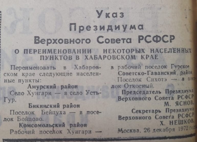 В 1972—1974 годах вследствие вооружённого конфликта с Китаем за остров Даманский (1969) в Приморском крае и, в меньшей степени, в соседних регионах было проведено массовое переименование географических объектов и населённых пунктов с целью избавиться от топонимов китайского происхождения.