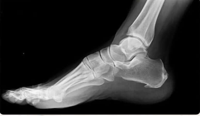 Продольные краевые микро надрывы заполняются плотными элементами, поэтому на рентгене в боковой проекции мы наблюдаем некий вырост из пяточ