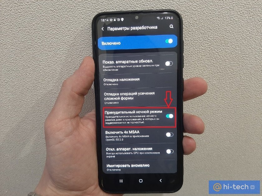 После того как вы перешли в меню разработчика, найдите здесь пункт «Аппаратное ускорение отрисовки» и активируйте «Принудительный ночной режим» с помощью переключателя.