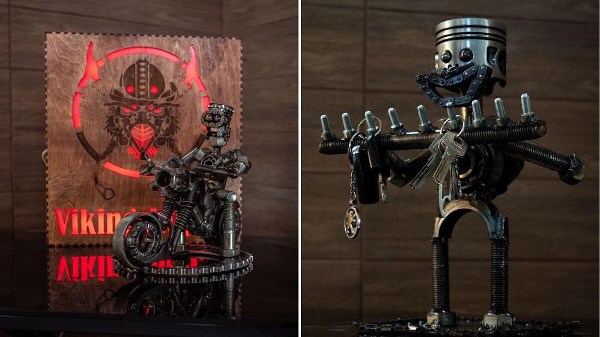 «Вместо того чтобы отвезти запчасти на металлолом, решил сделать из них что-то необычное»– Я учился в Минском радиотехническом колледже на программиста, затем пошел служить в армию. В студенческие годы подрабатывал по возможности. С детства я довольно плотно был связан с техникой: мотоциклы, машины, вездеходы – в общем, полный набор. К этому меня «подтянул» отец. Не сказать, что я профессионал, но свой автомобиль всегда делаю сам: от подвески и тормозной системы до двигателя. Наверное, ввиду технического склада ума на подсознательном уровне есть понимание работы всех узлов и агрегатов. Если иметь под рукой профильную литературу, не остается каких-либо вопросов. Из этого всего и появилось то, чем я занимаюсь сейчас.Как-то после очередных ремонтов накопилось много запчастей: цепи ГРМ, звезды, шестерни КПП. Вместо того чтобы отвезти их на металлолом, я решил сделать из этого что-то необычное. Да и, согласитесь, все эти технические изыски сами по себе выглядят завораживающе, особенно когда понимаешь, сколько в эту шестеренку было вложено трудов и сил инженеров и рабочих. Так в 2017 году появилась дебютная работа – викинг из металла. Скульптура викинга. Фото из личного архива герояМногие годы это было хобби, пару раз изготавливал работы на заказ. Люди сами меня находили, ведь перед участком стояла та самая работа викинга. Шли годы, с течением времени пришло осознание того, что можно заниматься этим на постоянной основе. Кстати, название мастерской ‒ VikingWorkshop ‒ появилось именно в честь первой серьезной скульптуры.«Для комфортного начала необходимо иметь около $5000»Практически весь инструмент для занятия моим делом у меня был, за это спасибо отцу. Со временем все недостающие предметы были куплены. Я считаю, что для комфортного начала необходимо иметь около $5000 на сварочный аппарат, компрессор, углошлифовальные машины, дрель, шуруповерт, краскопульты, граверы и остальное оборудование.Арендовать помещение для работы и склада мне тоже не пришлось, а ведь это была бы огромная статья расходов. Отец отдал мне маленький гараж со складом, который я переделал в мастерскую.В момент, когда мое занятие было только на уровне хобби, в создании работ участвовала вся семья. Теперь работаю один, так как это основной заработок, но по возможности мне помогает отец, потому что ему самому интересно заниматься этим. «Ежедневно работа занимает 10‒12 часов»Бизнес с работой в найме я не совмещал. Пришел из армии и сразу же начал заниматься исключительно этим делом. Да и времени на что-то другое попросту не остается. В начале августа будет ровно год, как я занимаюсь скульптурами на постоянной основе. Делаю работу не только под заказ. Мне нравится реализовывать именно свои задумки, получаю максимальное удовольствие от процесса, ведь меня не ограничивают бюджет и конкретные требования. Фото из личного архива героя Моя работа ежедневно занимает около 10‒12 часов. Бывает, дни напролет провожу за изготовлением новой скульптуры. А бывает и наоборот: нет сил работать, хочется переключиться на что-то другое. Точно знаю, что через силу заказ сделать не получится при всем желании. Это творчество, а не монотонная работа.Изготовление большой работы занимает от недели до месяца (в зависимости от детализации). Небольшую скульптуру можно сделать за 2‒3 дня. Бывали случаи, когда чел