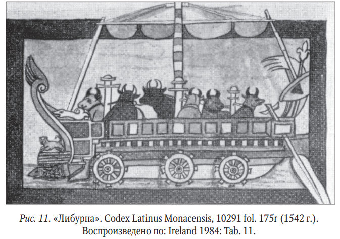 А вот это уже интересно... Трактат "О военных делах" (создан примерно в 370 году) содержит массу как откровенно странных, если не сказать бредовых "рацпредложений" для римской армии, так и вполне разумных, некоторые из которых принесли Риму большую пользу. Здесь речь в первую очередь о внедрении в войсках дротика-плюмбаты или маттиобарбулы, "марсовой колючки", хотя нам и неизвестно, приняли ее на вооружение благодаря именно этому документу, либо же причина была в ином... А кое в чем автор писания "О военных делах" вообще радикально опередил свое время! В частности, кажется, именно он изобрел (или у кого-то подсмотрел идею) корабль с гребными колесами. Во всяком случае, именно в этом источнике подобное транспортное средство описывается впервые в мире. XVII. Представление либурны Либурну, пригодную к морским войнам, которую из-за ее величины препятствует каким-либо образом передвигать руками мужей туда, куда призовет необходимость, человеческая слабость, приводит в движение сила животны