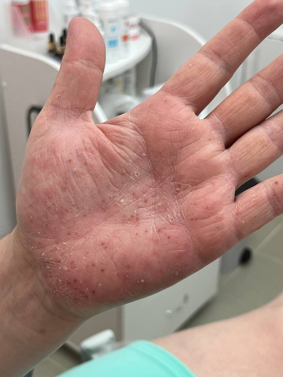 У нас в центре сложного педикюра и маникюра каждый клиент - это уникальный случай, требующий индивидуального подхода и заботы. Одним из крайних самых интересных и сложных кейсов, с которым нам пришлось столкнуться, стало лечение ладонно-подошвенного пустулеза. Это редкое заболевание, обычно требующее специализированного вмешательства дерматолога, но девушка обратилась в наш центр подологии и мы применили все профессиональные знания и опыт для решения проблемы. После тщательного изучения состояния клиента, мы разработали индивидуальную стратегию восстановления. В качестве домашнего ухода мы предложили ей использовать специальную крем-маску "HELPER". Помимо домашнего ухода, мы провели педикюр с применением специальных техник и инструментов, направленных на улучшение состояния стоп. Наши специалисты постарались обеспечить пациентке не только максимальную эффективность, но и комфорт. Через 3 недели после первого посещения клиента мы вновь встретились для итогового осмотра. Результаты были