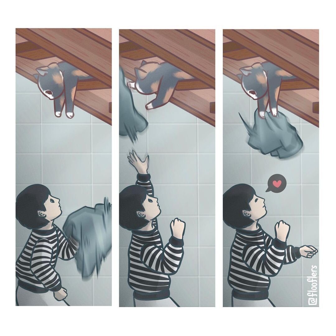 Ой, вот смотрела я видео с котиками, смеялась и почему-то думала, что это все редкие явления. До того момента, пока моя мама не привезла семь котиков. Двое останутся у меня, а остальные отправятся с ней в новый дом. Но сейчас они все здесь и постоянно что-то вытворяют. Особенно ночью. Если мне нужно отдохнуть и почитать вечером, то для них это означает, что можно еще побегать. И это прям громко. Все ценное приходится на ночь убирать со стола, так что ноутбук не оставишь. Все, что можно подрать покрыто пленкой антиточкой и так далее. И конечно такие ситуации, как в роликах из тик-тока - тоже много. Я увы их зарисовать не могу, зато художница из Японии именно ими и вдохновлялась. Автор: The Great Flooflers