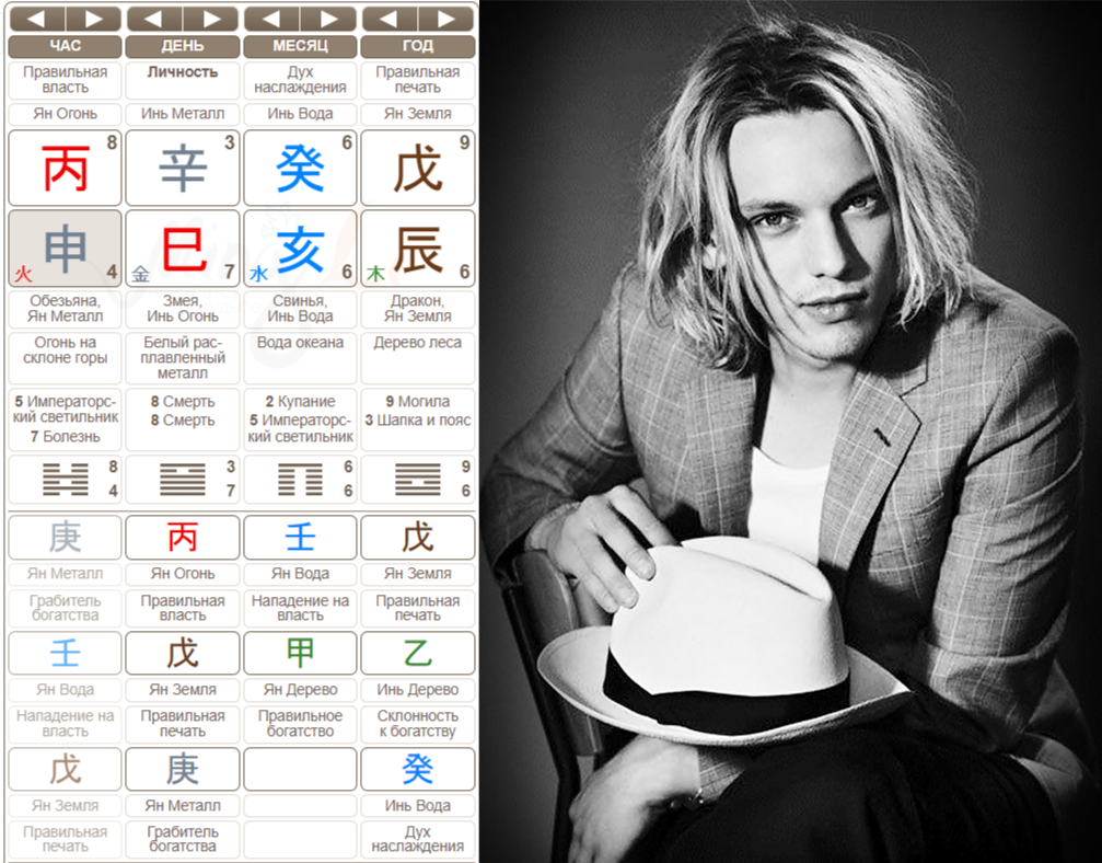 Я уже делала видео на эту тему. Там рассмотрены все 10 Божеств на примерах карт известных людей (Киану Ривз, Виктор Цой, Билл Гейтс, Жак-Ив Кусто, Владимир Путин, Дмитрий Медведев и др). В статье я хочу взять примеры карт, в которых признак проигрывается как-то по-особому. 1. Джейми Кэмпбелл Бауэр Вы его знаете по "Очень странным делам", "Орудиям смерти: Город костей" и др. Чем, собственно, особенна его карта? Мы видим в Небесном стволе года рождения - а именно он определяет первое впечатление о человеке - Правильную Печать. В видео я сделала упор на интеллектуальность такой персоны, но также упомянула, что Правильная Печать - это еще и семья. Так вот, мистер Бауэр - выходец из аристократического рода: у него имеется знатный предок: сэр Кэмпбелл, владелец наследуемого аристократического титула – баронет – выдаваемого британской Короной. Кстати говоря, Джейми - актер от бога, обладатель карты с Трансформацией Ци. Здесь мы видим слияния в Воду, и актер не скрывает, что боролся с алкого