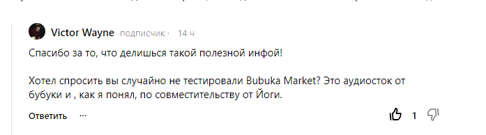 Всем доброго времени суток! Для начала начну с того что выражаю благодарность одному из подписчиков который задал этот вопрос. Спасибо, я об этой информации не знал. А дальше уже по этой теме. Списался по обратной связи с Yoga и узнал более подробно про Bubuka Market. Начнём. Поддержке был задан вопрос обо всех вкладках которые присутствуют в ЛК в разделе статистика. Вот вопрос: Ответ: Вопрос: Ответ: Из всего этого можно сделать вывод. Если мы подписали договор со всеми галочками, то автоматически попадаем во все сервисы Yoga. Только вопрос времени когда мы туда попадём. Возможно зависит, грубо говоря " от стажа". Но это только мои догадки конечно же. Пока что лично себя я там не наблюдаю, но теперь буду периодически проверять. Всем кто находится на сервисе Yoga могу порекомендовать проверить https://market.bubuka.info/ в разделе поиск на присутствие себя. Если нет, значит только ждать. Но я, если до осени у меня там треков не появится, попробую связаться через обратную связь ещё раз.