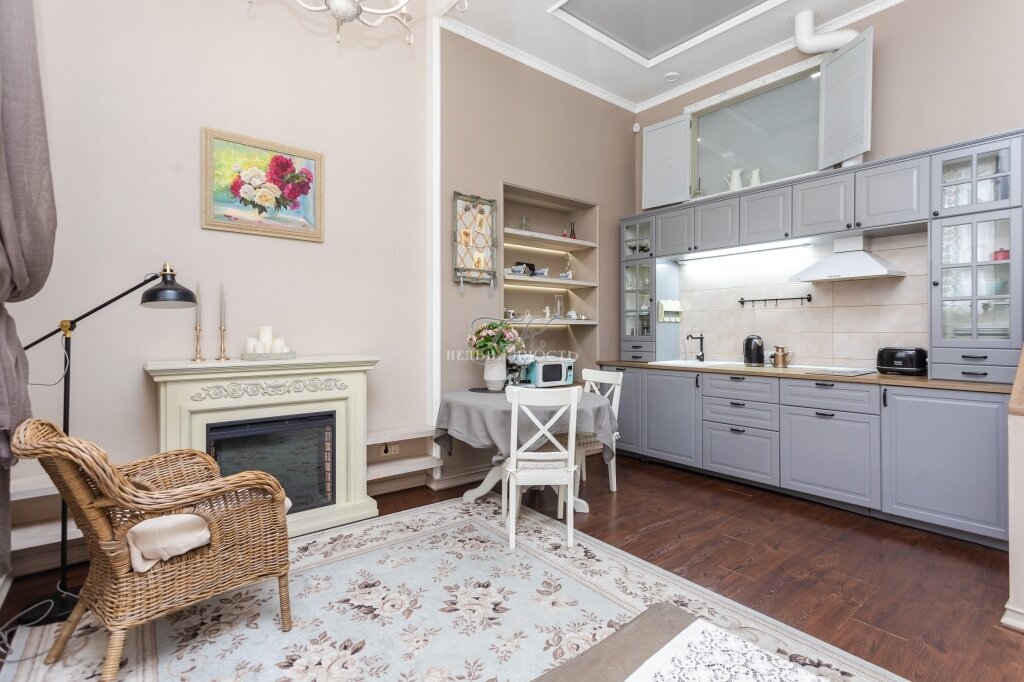 Интерьер реализован по индивидуальному дизайн проекту, в стиле Прованс. Просторная, светлая кухня-гостиная с потолками в 4.2 метра подчеркивает уникальность квартиры и создаёт особый шарм. Антресольный этаж, на котором расположилась спальная зона - элегантное продолжение Французского стиля. Завершением всей концепции является ванная комната с окном. В квартире имеется дополнительная комната, которую можно использовать как собственный кабинет, или вторую спальню.