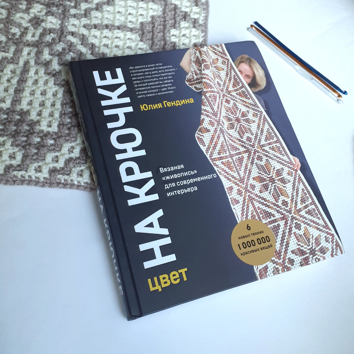 Как видите, книга не пылится на полке, а постоянно используется. И не только потому что творчество Юлии Гендиной мне близко, понятно, и я до сих пор ничего подобного не вязала, но и потому, что по её мастер-классам получаются действительно современные интерьерные вещи. Да и изобилие современной пряжи предрасполагает к подобному вязанию.