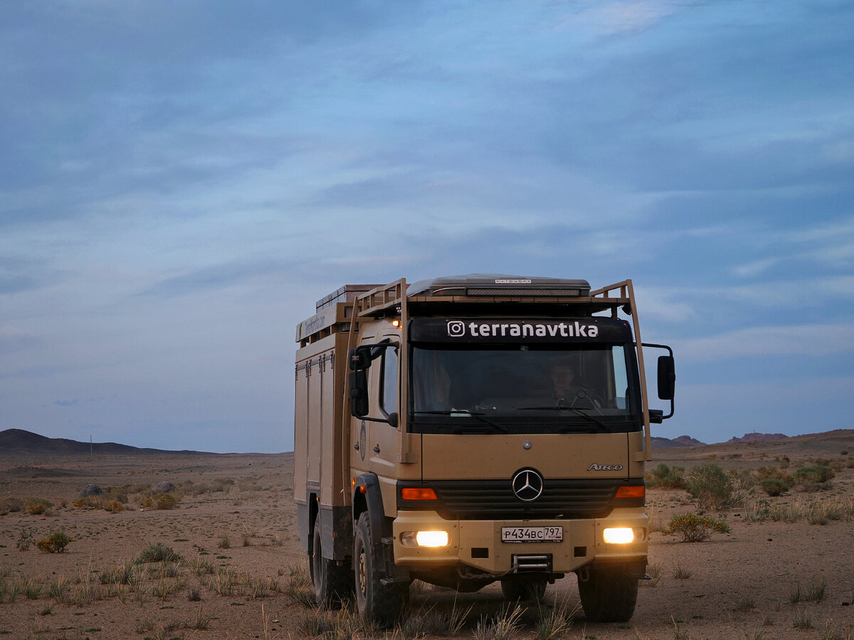Сопровождение больших групп путешественников или экспедиционеров на длинном автономном маршруте требует специальной техники, которая способна везти значительный объем груза, обеспечивать постановку лагеря в любом месте, везти большое количество технической и питьевой воды, продуктов, снаряжения... В недрах грузового отсека смонтированы отсеки и емкости под следующий набор: Внутри смонтирована система для подогрева воды, система водоснабжения и раскладная душевая кабина с тканевыми стенками что позволяет организовать горячий душ в любом месте. Также в грузовом отсеке имеется автономная система зарядки USB устройств и инвертор 220 вольт на 2кВт , что позволяет заряжать навигаторы, рации, телефоны и планшеты на всю команду. Грузовик MB Atego 4x4 обладает полным приводом и пониженным рядом передач, обут в крепкие внедорожные шины увеличенной размерности, благодаря двойной кабине может везти 4 человек команды (для них имеются оборудованные спальные места) сопровождения, имеет правильные док