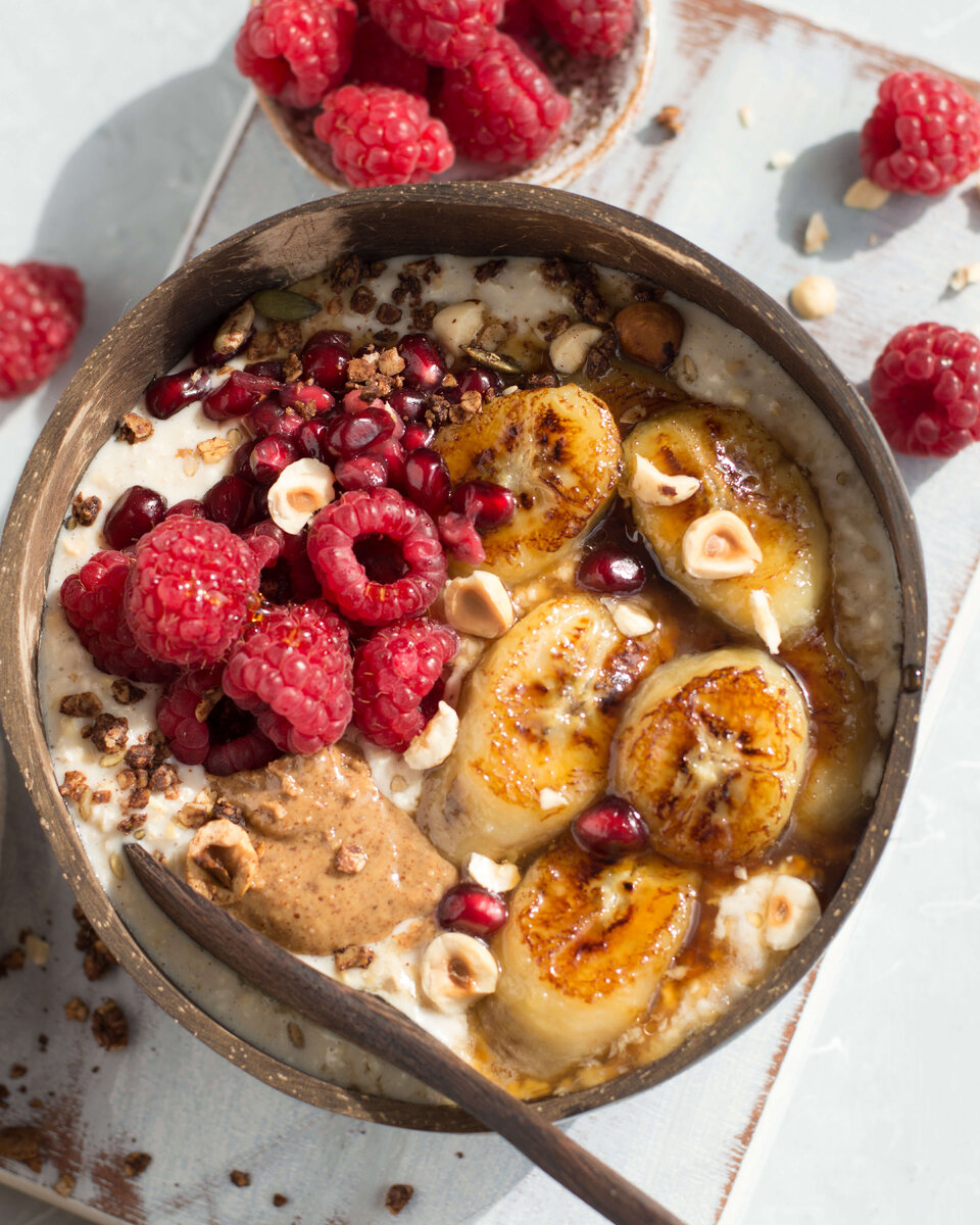 Чтобы приготовить овсянку: - Смешайте все ингредиенты ( хлопья, семена, сироп, молоко, корицу) в миске и хорошо перемешайте. - Поставьте в холодильник на ночь. - Овсянку можно есть его как холодной, так и горячей. Если вы предпочитаете овсянку горячей, просто разогрейте ее в течение пары минут в микроволновой печи или на плите в кастрюле. Отрегулируйте количество молока в зависимости от того, насколько густой вам нравится каша. Чтобы карамелизировать бананы: - Разогрейте на сковороде 1 столовую ложку кокосового масла. - Когда сков
