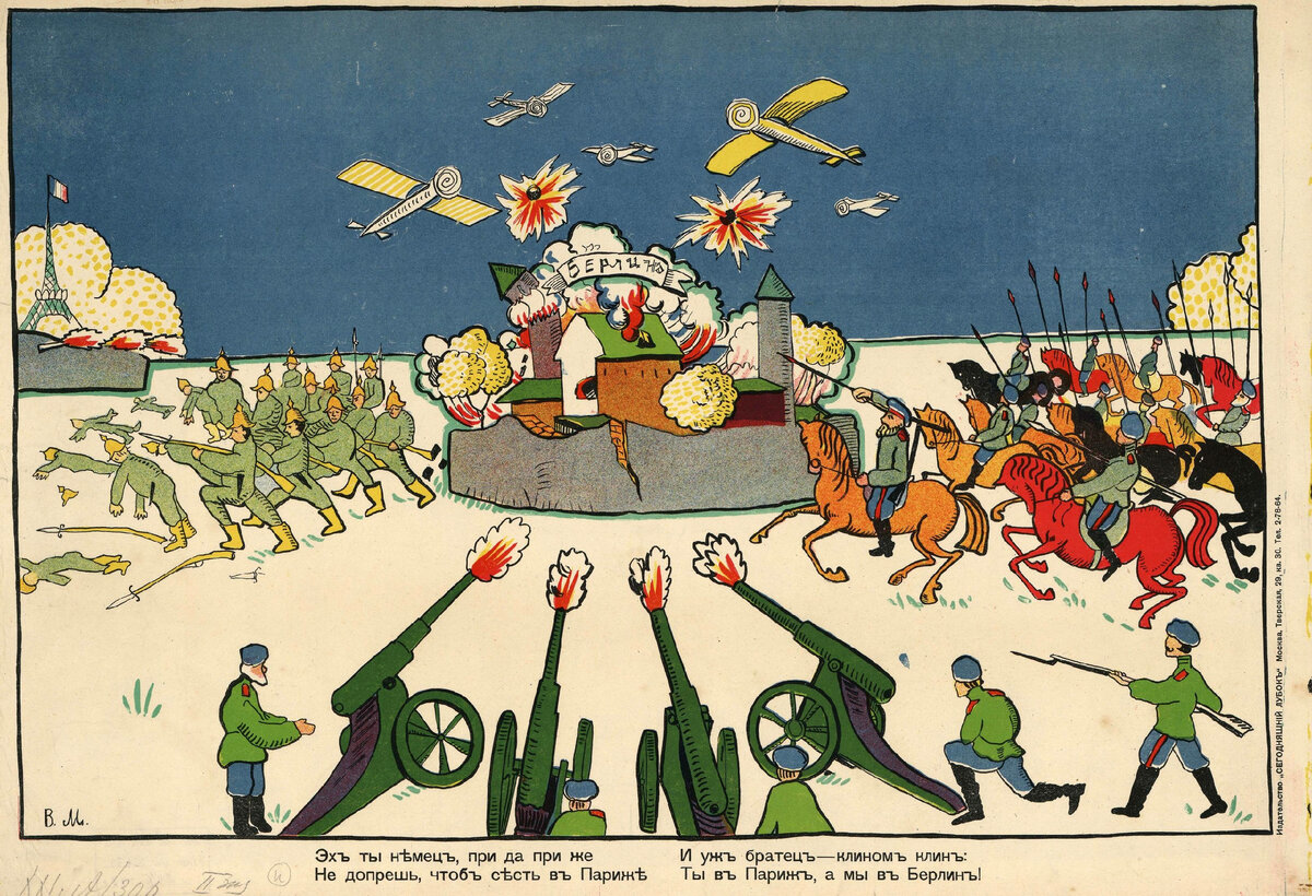 В августе «Четырнадцатого», когда началась большая заварушка, закончившаяся развалом великих империй, появился проект «Сегодняшний лубок», авторы которого хотели помочь в развитии патриотический настроений народных масс. В этой затее приняли участие, например, такие художники как Малевич и Лентулов. И если картины для лубков рисовали несколько художников, то почти всю стихотворную часть, за исключением одного из стихов, написал один поэт - Маяковский.