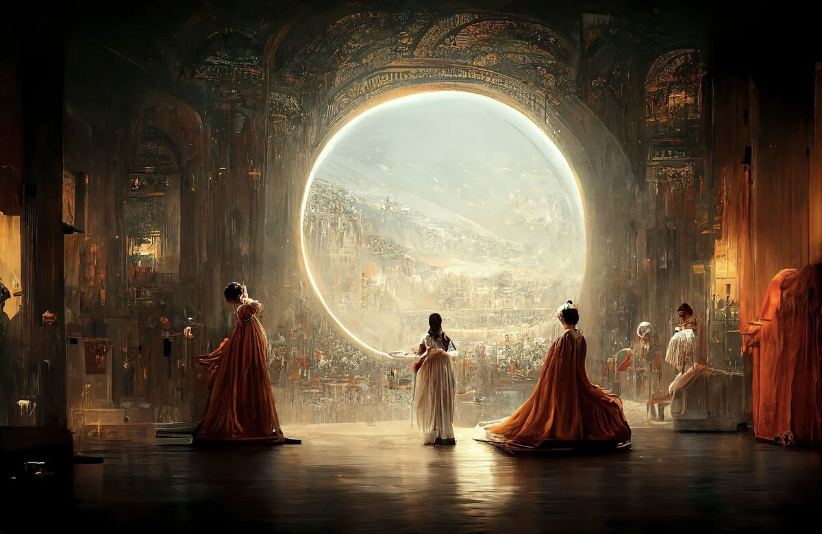 Название произведения - "Пространственный театр Оперы". Это AI-произведение стало первым своего рода, получившим награду на престижном художественном конкурсе, и признанной в категории начинающих цифровых художников. Однако картина вызвала разнообразные споры и была подвергнута критике в основном за то, что ее написал компьютер, а не человек. Рисунок, который отпечатан на холсте, изображает сцену, которая похожа на оперу в будущем. В зале, выполненном в стиле барокко, классические фигуры поднимаются по лестнице через круглое окно, открывая вид на пейзаж, озаренный солнцем.