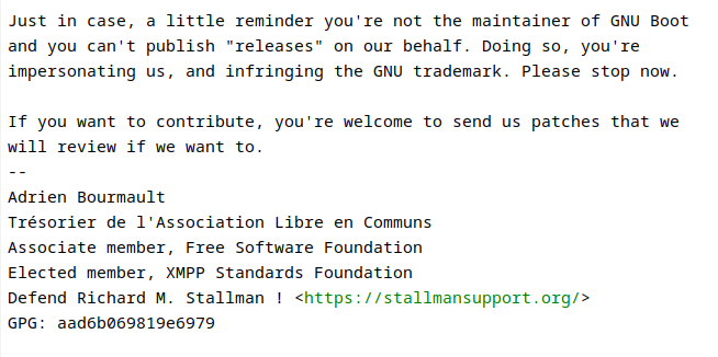 Адриан Бурмо (Adrien Bourmault), основатель проекта GNU Boot, направил Лии Роу (Leah Rowe), развивающей дистрибутив Libreboot, требование прекратить использование имени GNU Boot для распространения своей сборки. Две недели назад Лия опубликовала урезанную сборку Libreboot под именем GNU Boot, снабдив её пометкой "неофициальная". В претензии указано, что Лия не является мэйнтейнером GNU Boot и не имеет права публиковать релизы от имени данного проекта. При желании участвовать в разработке следовало прислать патчи для рецензирования, а не создавать свой релиз. Официальный проект GNU Boot был создан в июне 2023 года, за месяц до сборки Лии, и ещё не успел сформировать собственный выпуск. Проект GNU Boot планировал развивать форк Libreboot, использующий более жёсткие требования к включению бинарных компонентов, и предложенная Лией сборка решала эту задачу. Лия пояснила, что, создав свою неофициальную сборку, она лишь хотела помочь новому проекту - предполагалось, что создатели GNU Boot смо