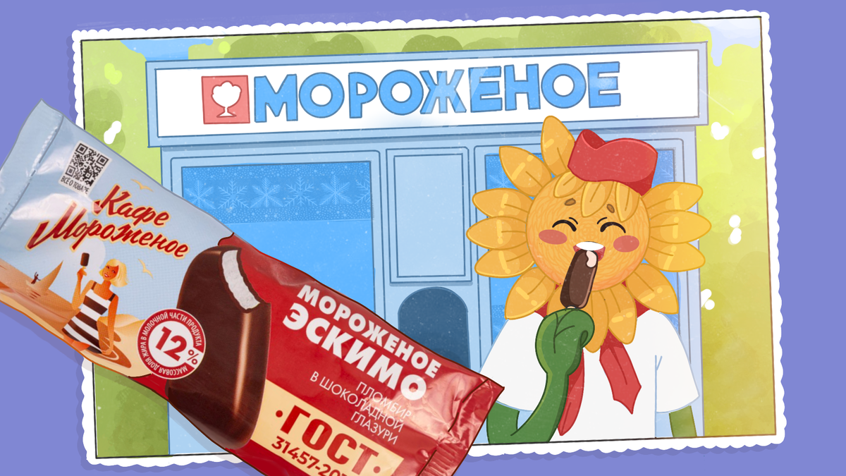 Одним жарким летним днем Подсолнух прогуливался по парку и увидел ларек с мороженым. Он тут же вспомнил, как мама в детстве покупала ему эскимо на палочке — самое вкусное лакомство на свете. Сначала он, как и все дети, съедал ломкую шоколадную глазурь, а затем приступал к белой сливочной серединке. Под воздействием ностальгии Подсолнух купил эскимо в ларьке, и разочарованию его не было предела. Как эксперт по качественным продуктам и руководитель клуба «Качество в подарок», он решил, что обязан разобраться, почему мороженое стало невкусным. И, разумеется, найти эскимо, со вкусом из детства. Почему эскимо уже не то, что раньше? Сейчас производители часто заменяют молоко и сливочное масло растительными жирами, а шоколадную глазурь - кондитерской, которую готовят на основе пальмового масла, т.к. какао — продукт дорогой. Таким образом они пытаются удешевить процесс производства. Однако в связи с этим неизбежно страдает качество и вкус эскимо. Эскимо по ГОСТу — Если хочешь попробовать эск