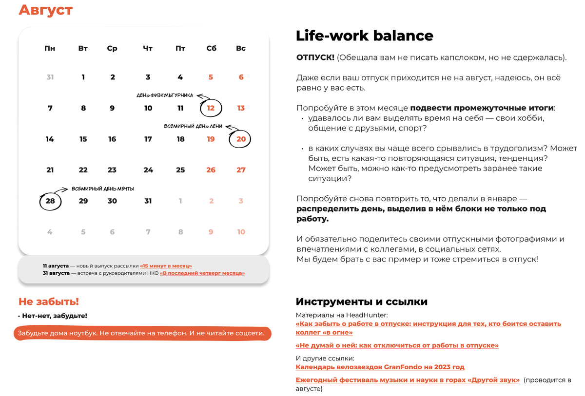 Август в календаре руководителя. Август — это астры, август — это звезды? Перефразируя знаменитую поэтессу, мы скажем, что август — это отпуск) Что такое календарь руководителя Сегодня поделимся с вами одним месяцем из нашего выпуска рассылки «Календарь руководителя». Кроме советов и личного опыта, в каждом месяце календаря вы найдете полезные инструменты и ссылки. Например, в августе — материалы на HeadHunter: «Как забыть о работе в отпуске: инструкция для тех, кто боится оставить коллег «в огне» и «Не думай о ней: как отключиться от работы в отпуске». Хотите себе такой календарь? Тогда переходите на наш праздничный лендинг и оформляйте подписку на рассылку «15 минут в месяц»: https://sugarfree.expert/year В честь дня рождения проекта мы дарим три выпуска: - «Календарь руководителя», - «Коммуникации», - «Финансы». Расскажите, а с чем у вас ассоциируется август?