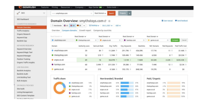 Конкурировать на международном рынке — это значит понимать конкурентную среду. Нужно знать, кто является онлайн-прямыми и непрямыми конкурентами. Это можно сделать с помощью разных инструментов, в том числе, Semrush.