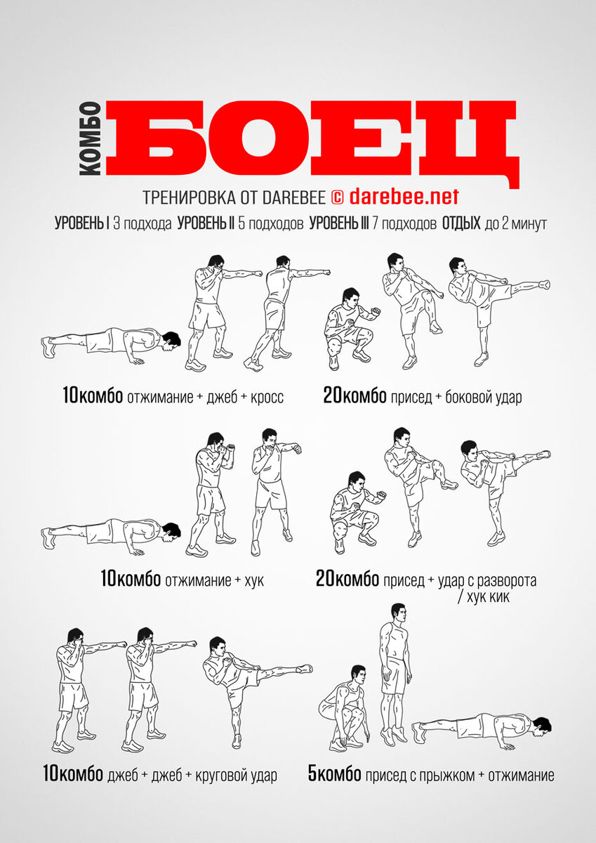 Новый релиз — Боец Комбо Наша тренировка Боец Комбо расширит все ваши границы и даже больше. https://darebee.net/combo-fighter-workout.html ЦЕЛЬ: все тело ТИП: боевые искусства СЛОЖНОСТЬ: 4 — НЕ ПОДХОДИТ для начинающих