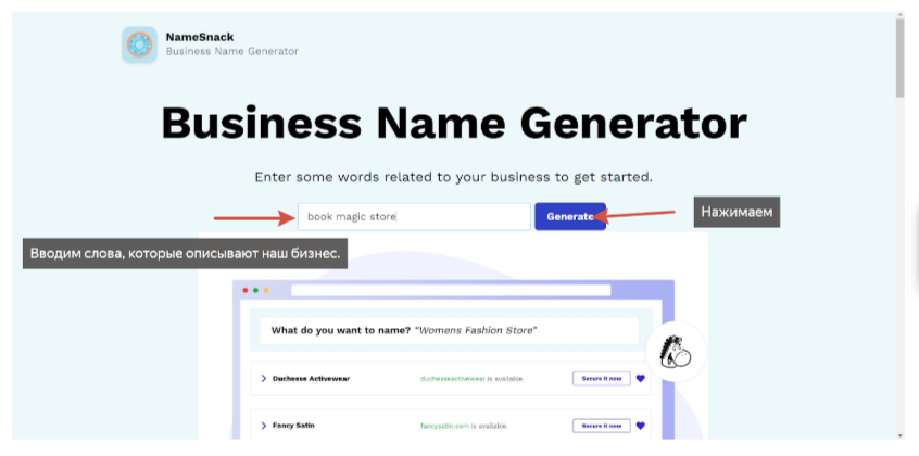 Namesnack сгенерирует название для вашего бизнеса. Проверит свободен ли адрес сайта с сгенерированным названием.