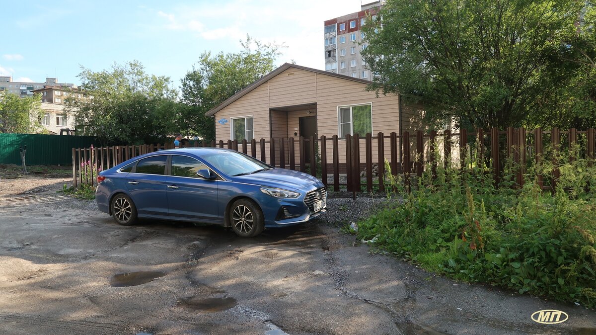 Навигатор привел нас к заданному адресу нашего жилья, но само жилье мы никак не могли найти, пока не обратили внимание на маленький деревянный домик, затерявшийся среди многоэтажек. На нем была табличка с искомым адресом. Оказалось, что это и есть наши апарты.