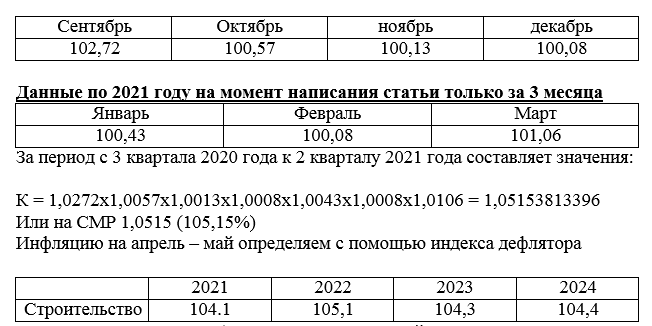 Индекс-дефлятор на конец первого года строительства декабрь 2021 умножается на индекс-дефлятор на конец второго года строительства 2022 и умножается на среднее арифметическое между январем и августом 2023. Итого индекс прогнозной инфляции = 0,1923 х 1,0276 + 0,4615 х 1,05453+ 0,3462 х 1,0872 = 0,1976 + 0,4867+ 0,3764 = 1,0607