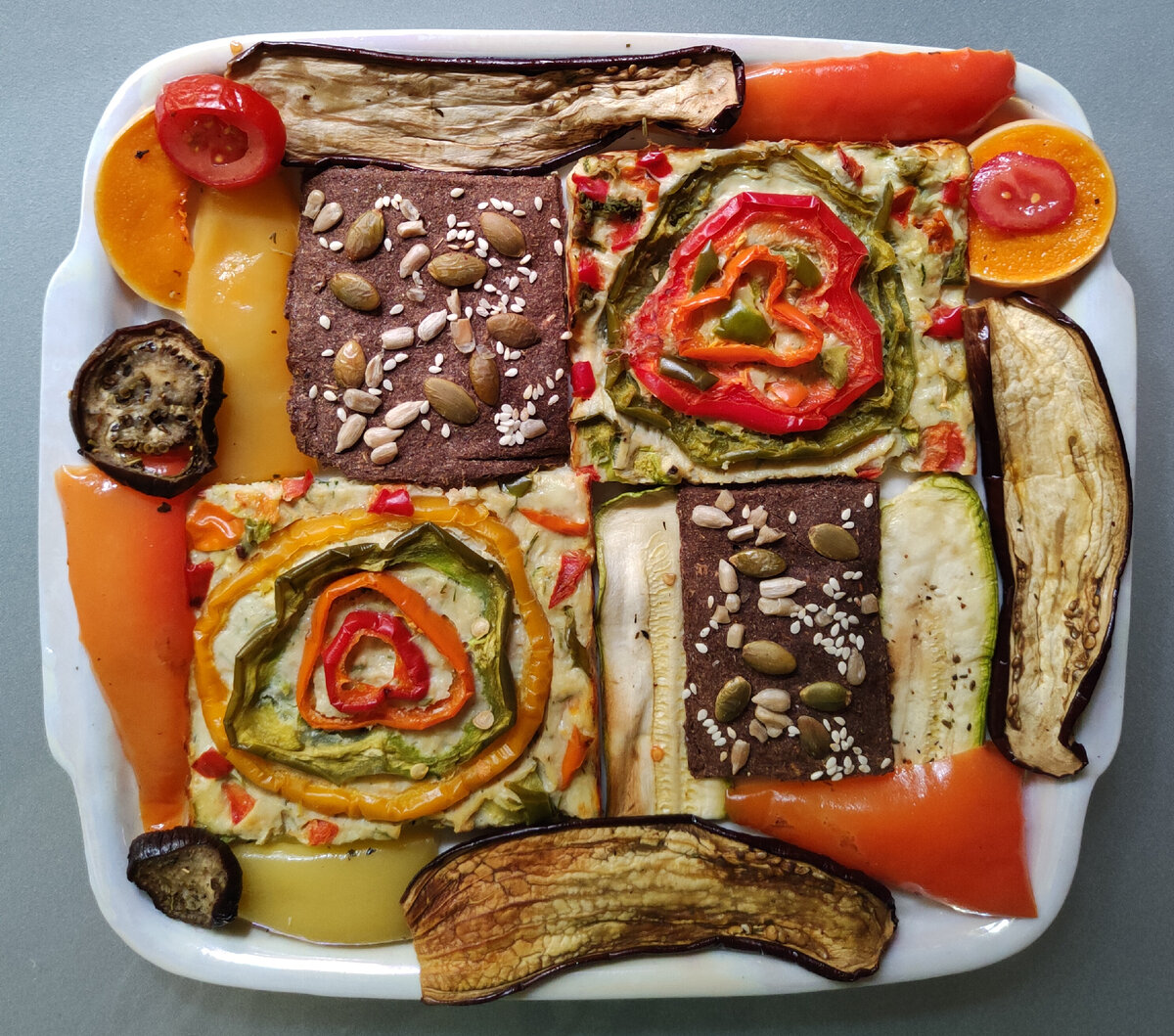 Приветствую вас! Не будет преувеличением сказать, что заливные пироги - одно из самых удобных и вкусных блюд правильного питания. В качестве начинки можно использовать любые овощи, фарш из мяса, птицы, рыбы. А в качестве заливки я использую смесь: 4 яйца, 3 ст.ложки кефира, 3 ст.ложки безглютеновой муки, 1/2 ч.ложки соды или разрыхлителя. Если овощи водянистые, добавляю ещё муки. Сегодня просто хочу показать варианты обедов или завтраков с кусочками заливных пирогов. Пирог с кабачками, капустой, морковью, куриной печенью и грибами. В качестве декора - цветы кабачков и стрелки лука. Этот пирог - нечто среднее между заливным пирогом и мясным хлебом, т.к. белковой составляющей было довольно много, 50/50 с овощами. Я люблю печь такие пироги, добавив немного других овощей и крупы, получаем полноценное, сбалансированное по КБЖУ блюдо. Пирог тоже с кабачками, морковью, перцами и фаршем из куриной грудки. Одну часть теста и начинки быстро пожарила на сковороде в виде большой котлеты, т.