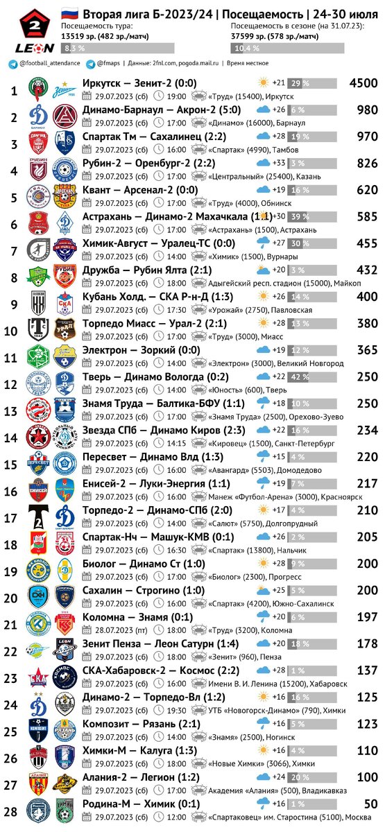 Посещаемость Второй лиги Б-2023/24 на неделе 24-30 июля