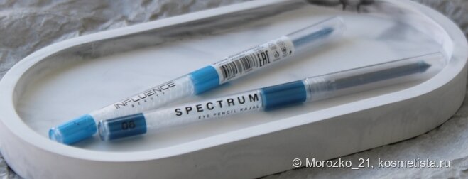 Здравствуйте! Этим вообще не жарким летом мне как никогда захотелось чего-то яркого и по-настоящему летнего. Выбор пал на два очень красивых оттенка карандаша Influence Beauty Spectrum Eye Pencil Kajal — синий и ярко-голубой. Упаковка у карандашей простая-легкий прозрачный пластик, на который нанесен цвет карандаша. Изначально оба были запаяны в прозрачную слюду. Выкручиваются и возвращаются на место карандаши без проблем. А ещё, благодаря их прозрачной «одежде» сразу видно, как они расходуются. Карандаши автоматические, гелевые. Хорошо рисуют как на веке, так и на слизистой. Именно для работы на ней я их и покупала. Также отлично потом и держатся там. Смыть их простой водой и молочком сразу у вас вряд ли получится. Только спец. средством, мое гидрофильное масло, кстати, тоже берет их не сразу, но если подольше помассировать пальцами веки, то они все-таки сдаются и растворяются, удаляясь без следа. Работать с ними необходимо не мешкая, иначе можно столкнуться с тем, что карандаш уже н