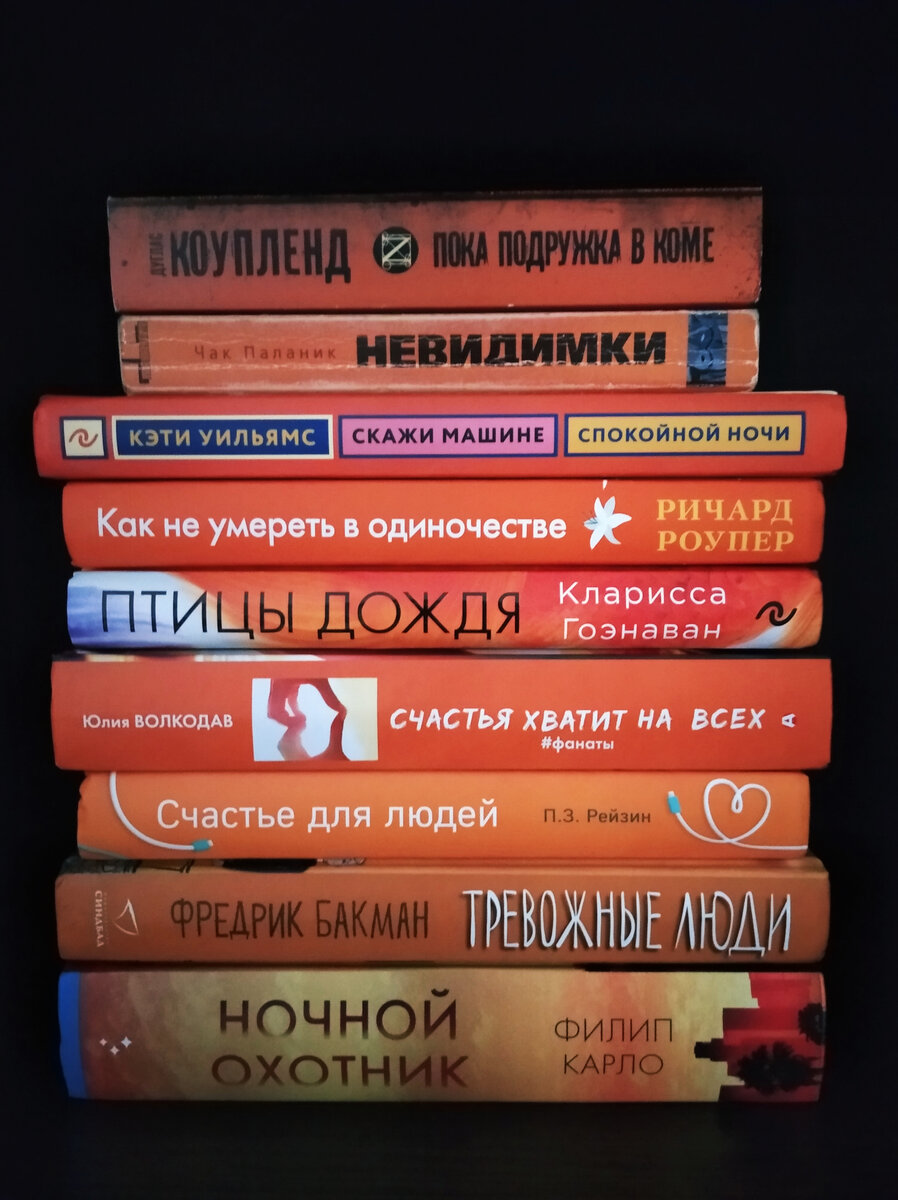 У меня оказалось так много оранжевых книг, что я решила разбить статью на две части. 😅 Конкретно в этой подборке прочитана всего одна книга и еще одна надкушена. Ночной охотник. Вот эту я и надкусила. Это про маньяка Ричарда Рамиреса. Прочитала где-то страниц 60, язык показался суховатым, под настроение не зашло, поэтому книгу пришлось отложить. Да и объем внушительный. Но я обязательно к ней вернусь... в свое время. Счастья хватит на всех. Даже не знаю, как вам про эту книгу рассказать. 😅 Ситуация "кто знает, тот знает". Это история про трех девушек-фанаток эстрадного артиста... От меня звучит дико, но это правда классная книга. Получилось так, что я слушала начитку второй части на канале автора и просто влюбилась в персонажей, такие они вышли живые. А потом уже читала эту книгу, это первая часть. А еще здесь достаточно стекла, можно обхрустеться. Пока подружка в коме. Я нагло скопирую аннотацию, потому что не могу переписать ее своими словами. Только фразой "ничего не понятно