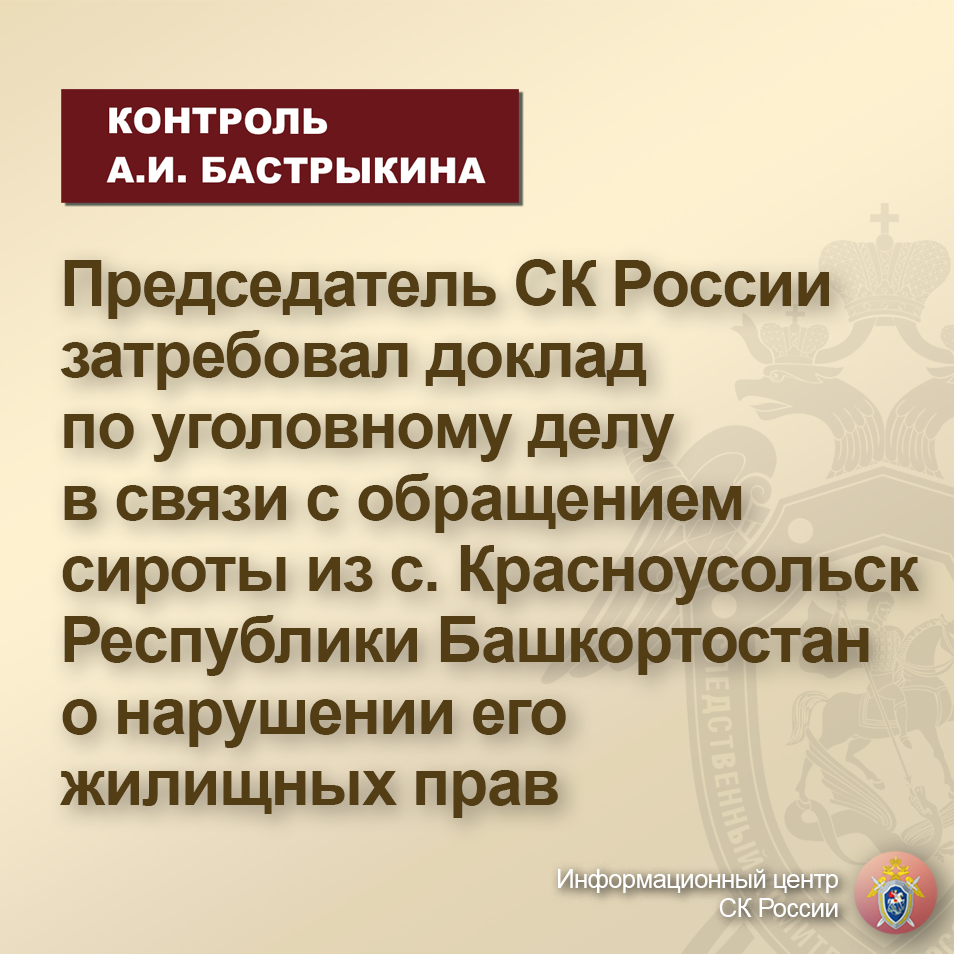 Председатель СК России затребовал доклад по уголовному делу в связи с обращением сироты из с. Красноусольск Республики Башкортостан о нарушении его жилищных прав