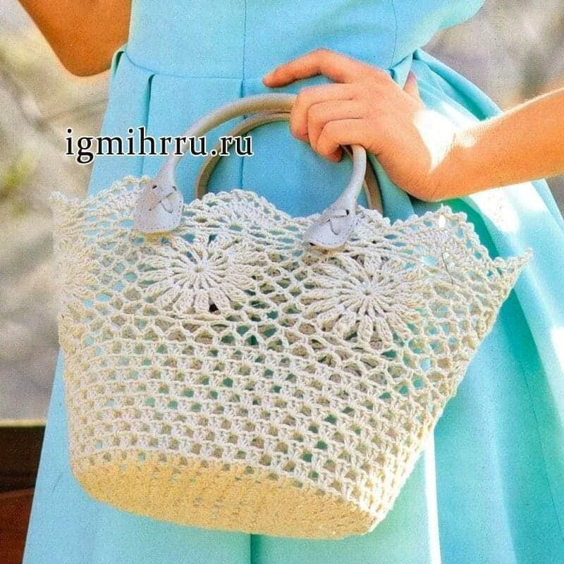 Мои друзья, подброшу вам ещё немного идей с сумками. Как-то эта тема очень хорошо вошла в интернете и в жизни. И это понятно - во-первых, можно сделать сумочку самому, причем если не сложную, то уж совсем простую спицами и крючком. А можно ещё проявить фантазию и навешать на неё всякие украшения, цветочки, пуговки, и вы - в тренде))). Ваша сумка вообще единственная в мире. Это прямо завораживает. Начнем. 1. Корзинка крючком со схемой. 2. Бабушкин квадрат - игра цвета и новая сумка готова) 4. Немного идей больших шопперов крючком. Раньше мы это называли сумки хозяйственные))), и так мне даже больше нравится. И тут уж не до каблуков. И сразу вспоминается - " я и баба, и мужик" Мне кажется в эту сумку я и сама бы поместилась))): 5. Сумка зигзагами со схемой. 6. Сумочка с колосками крючком. Схема. 7. Интересная по дизайну сумка крючком. Вязка может быть разной. Выкройка сумки. 8. 9. Хорошенькая сумочка крючком. Прям похожа на ловца снов, неправда ли? Схема вязки сумки.