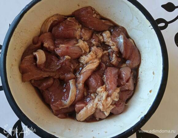 лапша - 200г Шаг: 1 Свинину режем на небольшие кусочки, добавляем 2 ст. л. соевого соуса и рисовый уксус и оставляем минимум на час мариноваться. Отвариваем яичную лапшу, как указано на упаковке. Отвариваем яичную лапшу до состояния 90% готовности и промываем холодной водой. Шаг: 2 Морковь, сладкий перец и